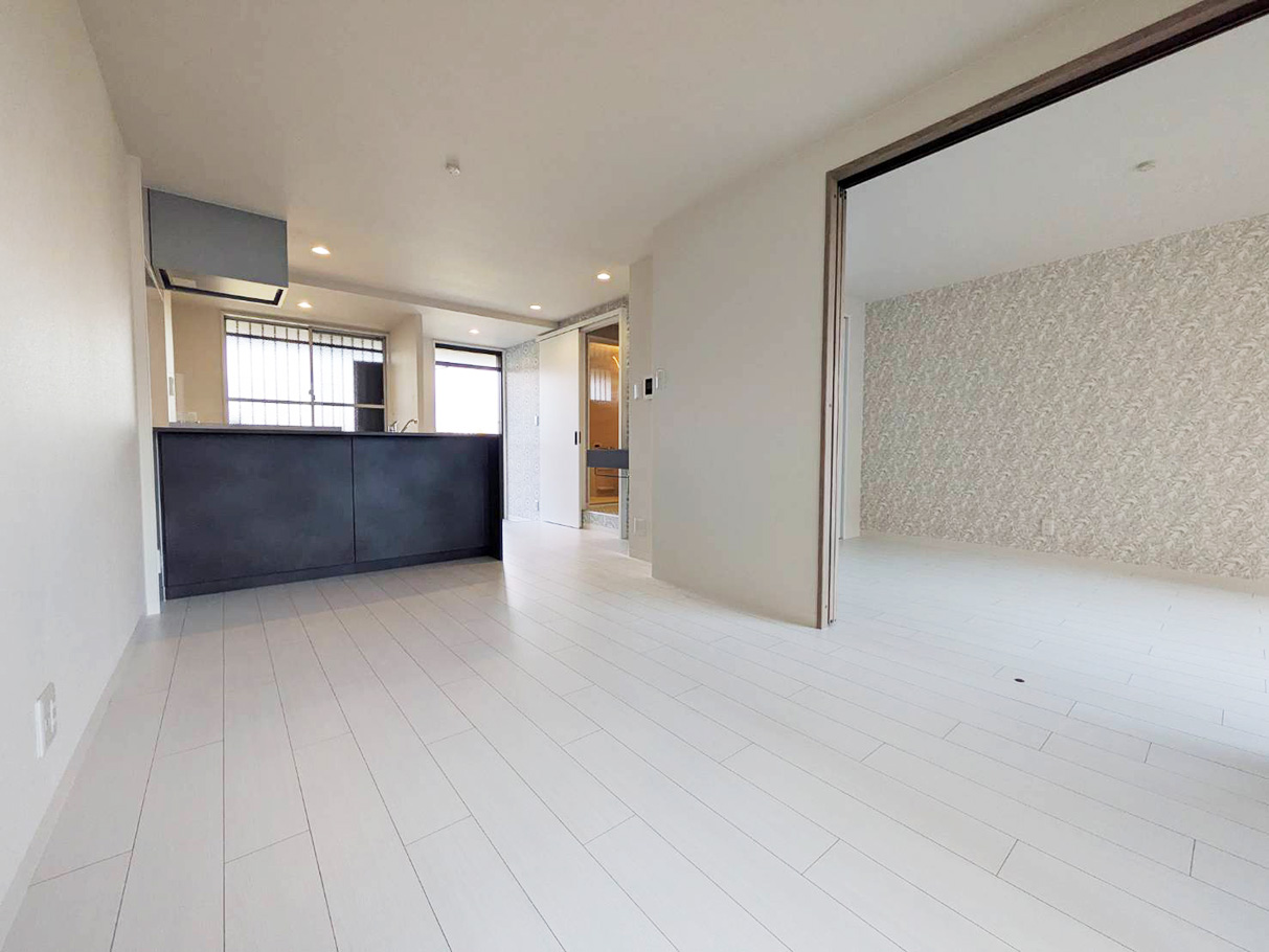 白を基調とした空間に、造作カウンターや収納棚をバランスよく配置。