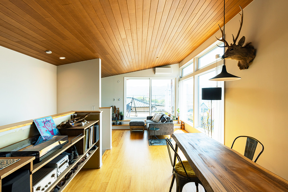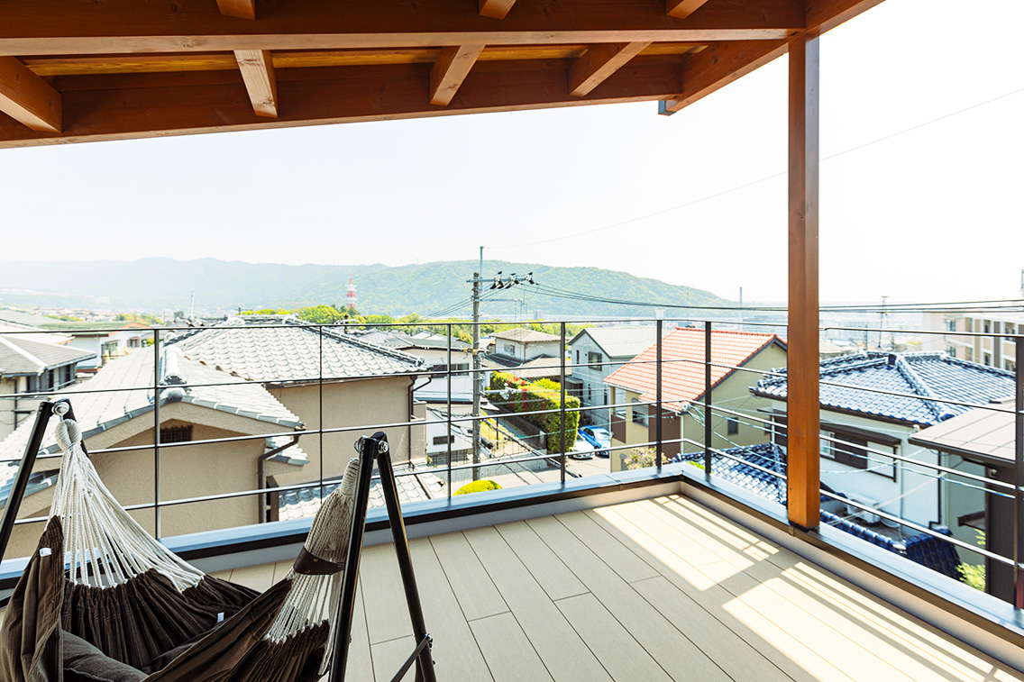 2階リビングからつながるテラスに大きな吹き出し窓があり、眺望が一望でき、採光を十分にとりこめることで明るい住空間を実現。